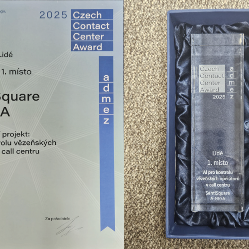 Společně s firmou SentiSquare jsme získali 1. místo v kategorii Lidé v soutěži Czech Contact Center Award! Soutěž oceňuje inovativní projekty v oblasti call center, a náš společný projekt využívající umělou inteligenci pro kontrolu a vyhodnocování hovorů operátorů ve věznicích zaujal porotu i odbornou veřejnost. Moderní AI aplikace firmy SentiSquare nám pomáhá hlídat kvalitu a efektivitu komunikace, a tím i zvyšovat bezpečnost i profesionalitu našeho provozu. Děkujeme za ocenění.
